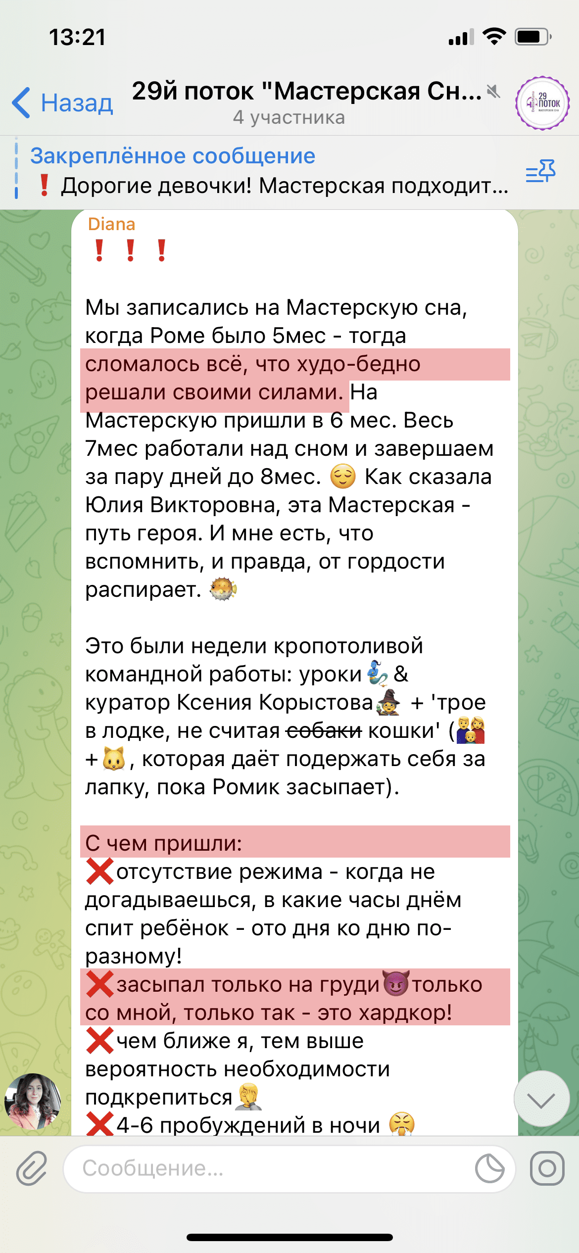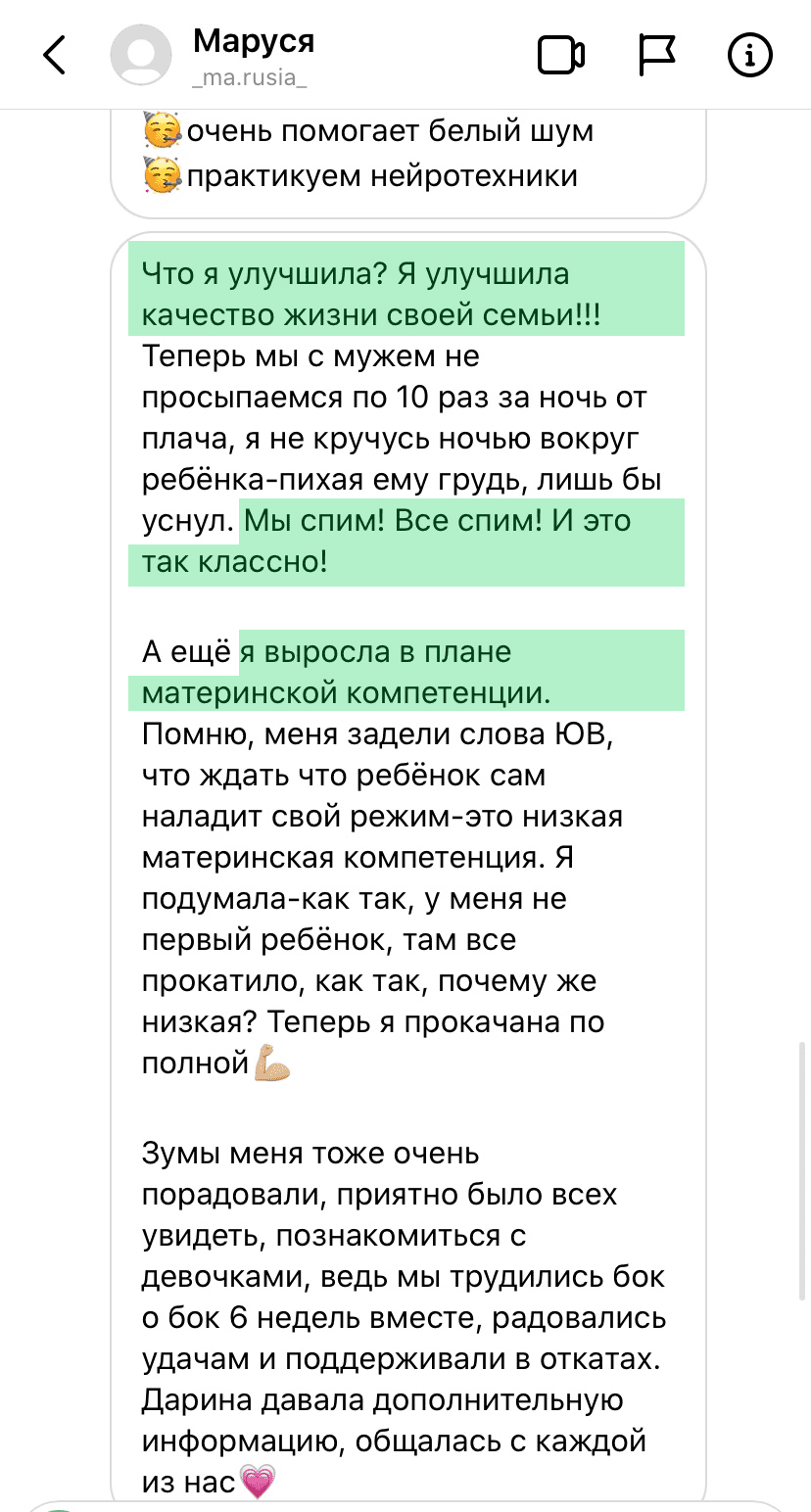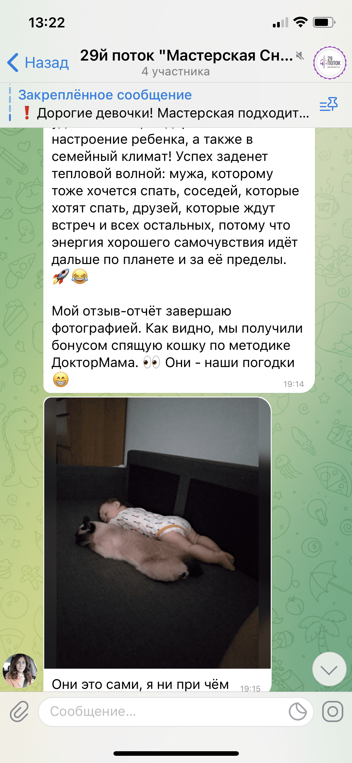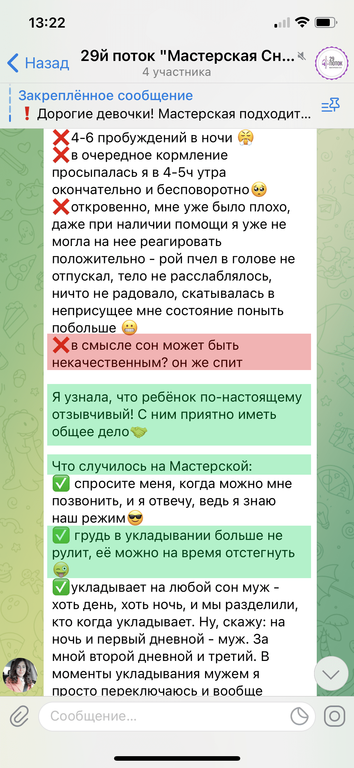- Доступ к чату выпускников, где можете обмениваться опытом с другими мамами, а опытная Супервайзерка раз в неделю отвечает на Ваши вопросы по сну