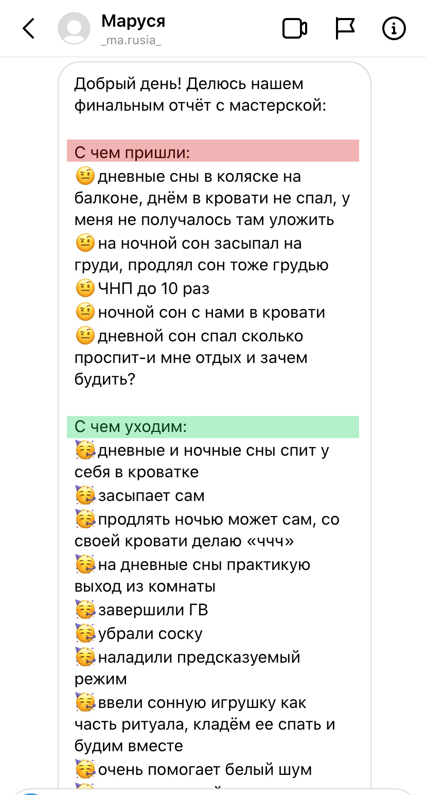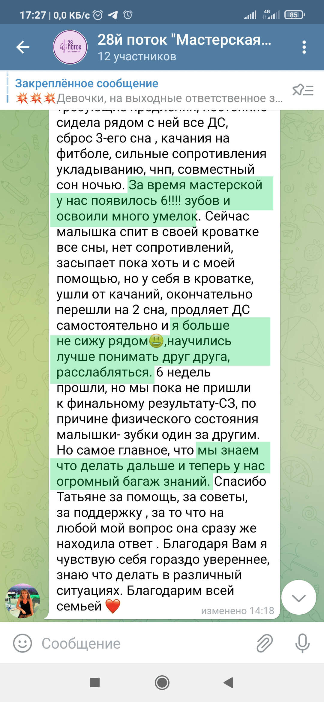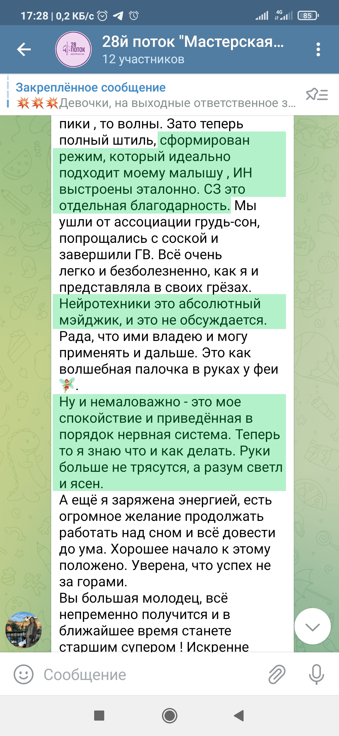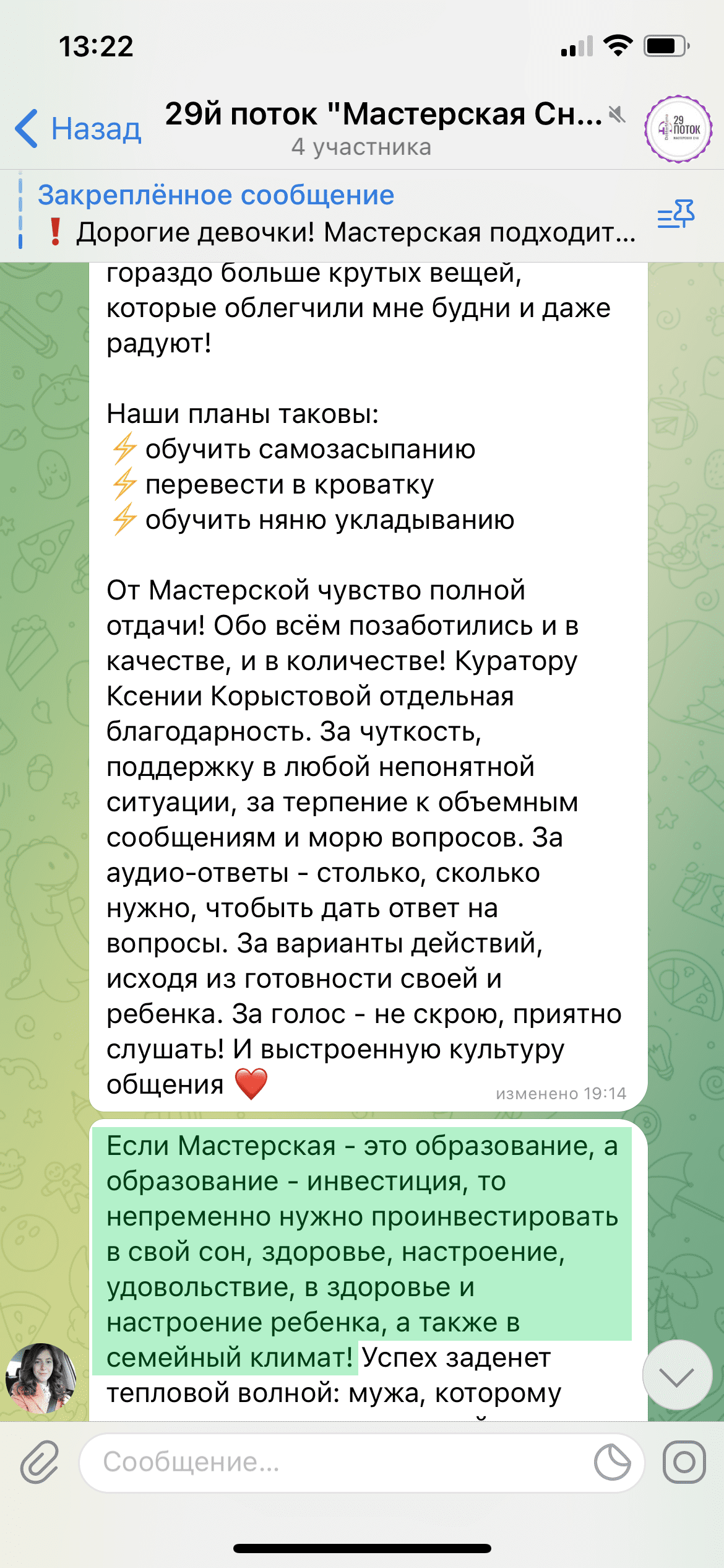 - Доступ к чату выпускников, где можете обмениваться опытом с другими мамами, а опытная Супервайзерка раз в неделю отвечает на Ваши вопросы по сну